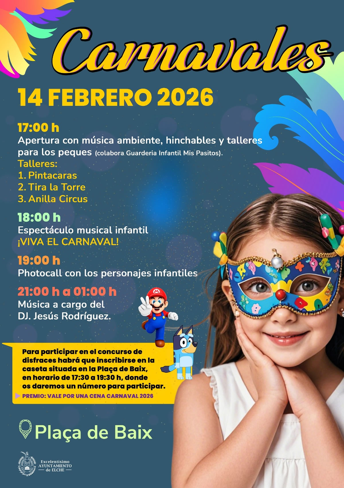 El sábado 14 de febrero, la Plaça de Baix será el escenario de la celebración del Carnaval de Elche 2026. Niños, jóvenes, adultos y familias serán los auténticos protagonistas del Carnaval ilicitano, con concursos de disfraces, talleres, música y espectáculos.