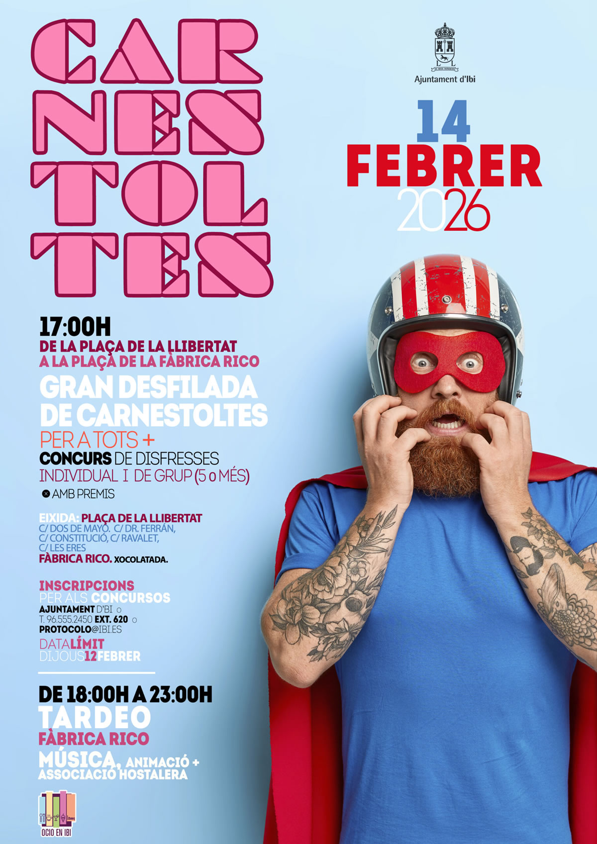 El Ayuntamiento de Ibi organiza, para el sábado 14 de febrero, el Carnaval 2026, con la celebración de un gran desfile de Carnaval para todos los públicos, la organización del concurso de disfraces y el tardeo con música y animación. La localidad se llenará de música, color y ritmo para celebrar, un año más, un divertido día de disfraces.