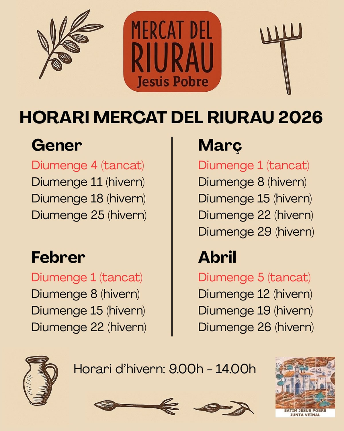 El Mercat del Riurau tiene lugar todos los domingos en el Riurau de Jesús Pobre, en Dénia, excepto el primer domingo de cada mes, que se celebra en la plaza del Ayuntamiento. Cada domingo se realizan diferentes actividades, todas ellas gratuitas.