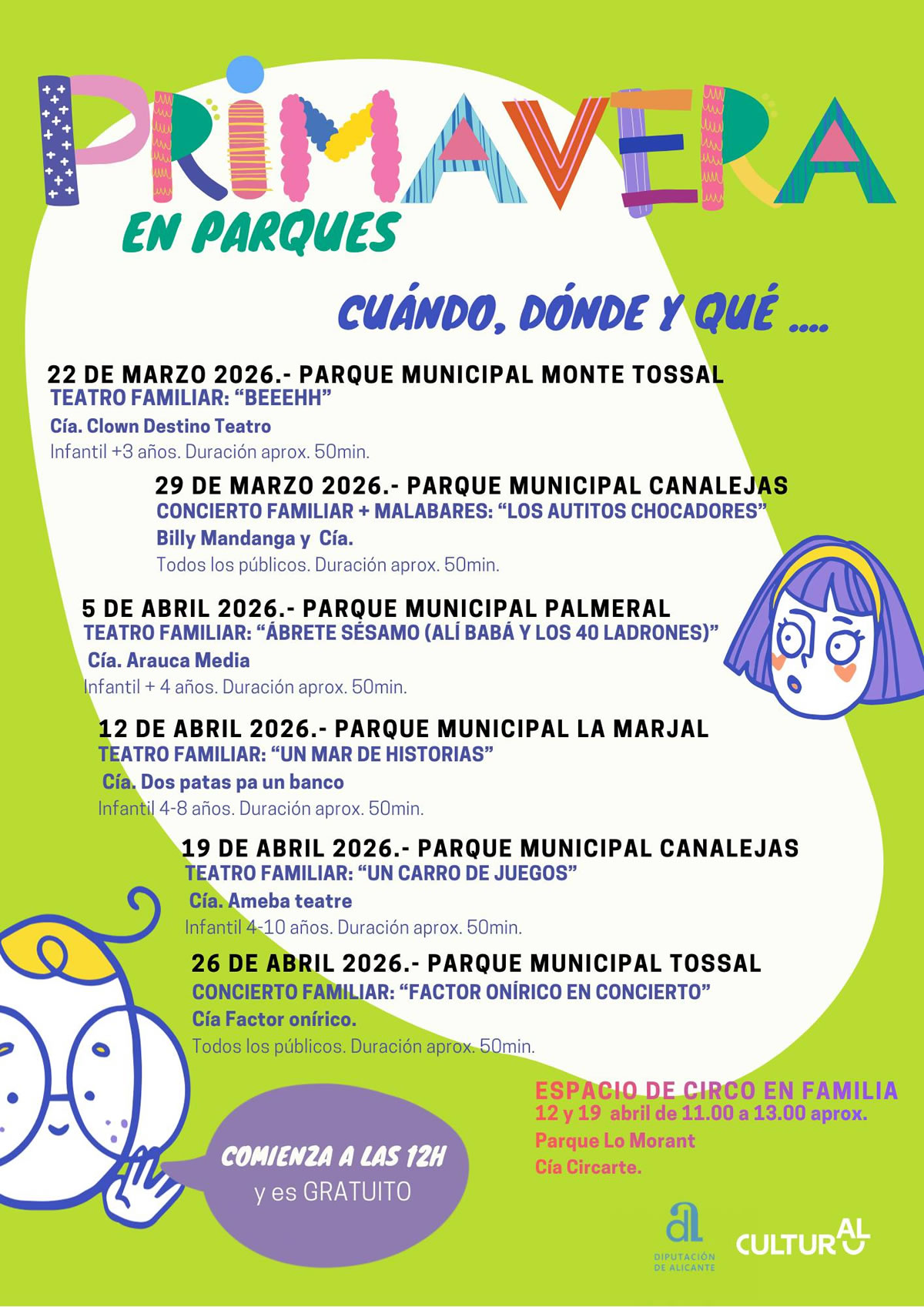 Primavera en Parques regresa un año más con propuestas de teatro, musicales, circo y clown gratuitas en los parques de Alicante. Un plan perfecto para disfrutar los domingos en familia y al aire libre.